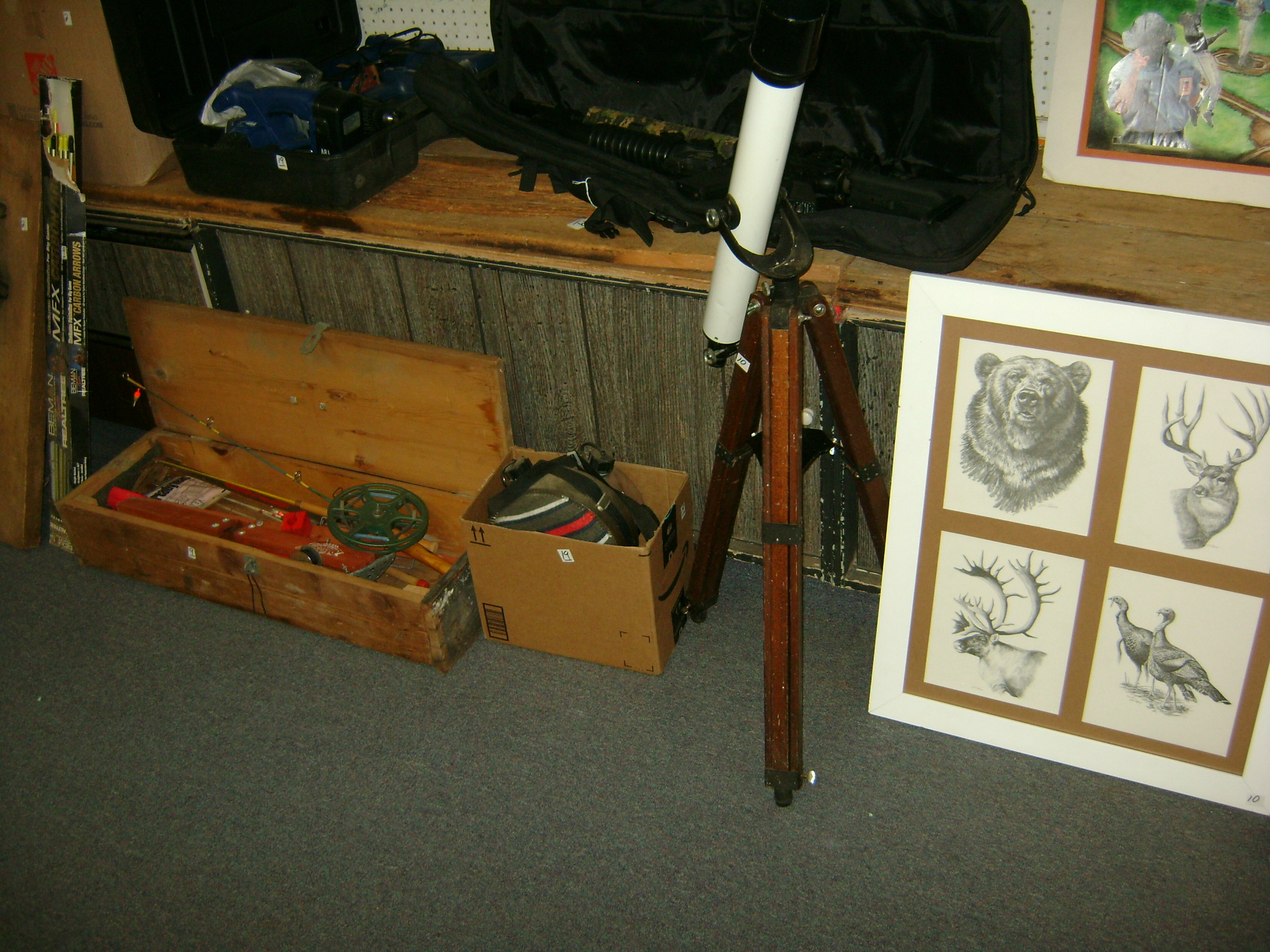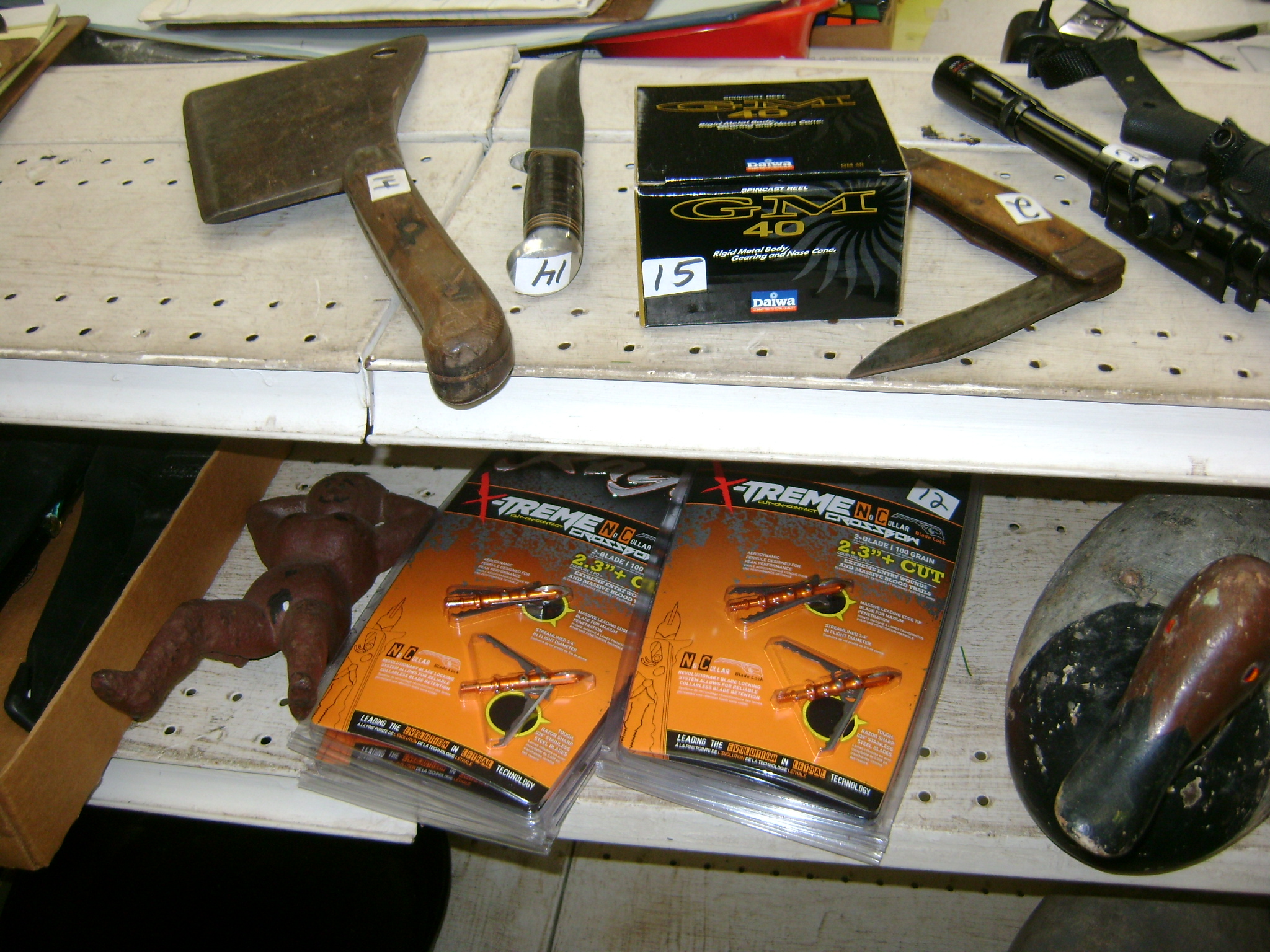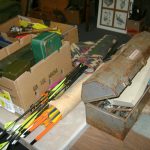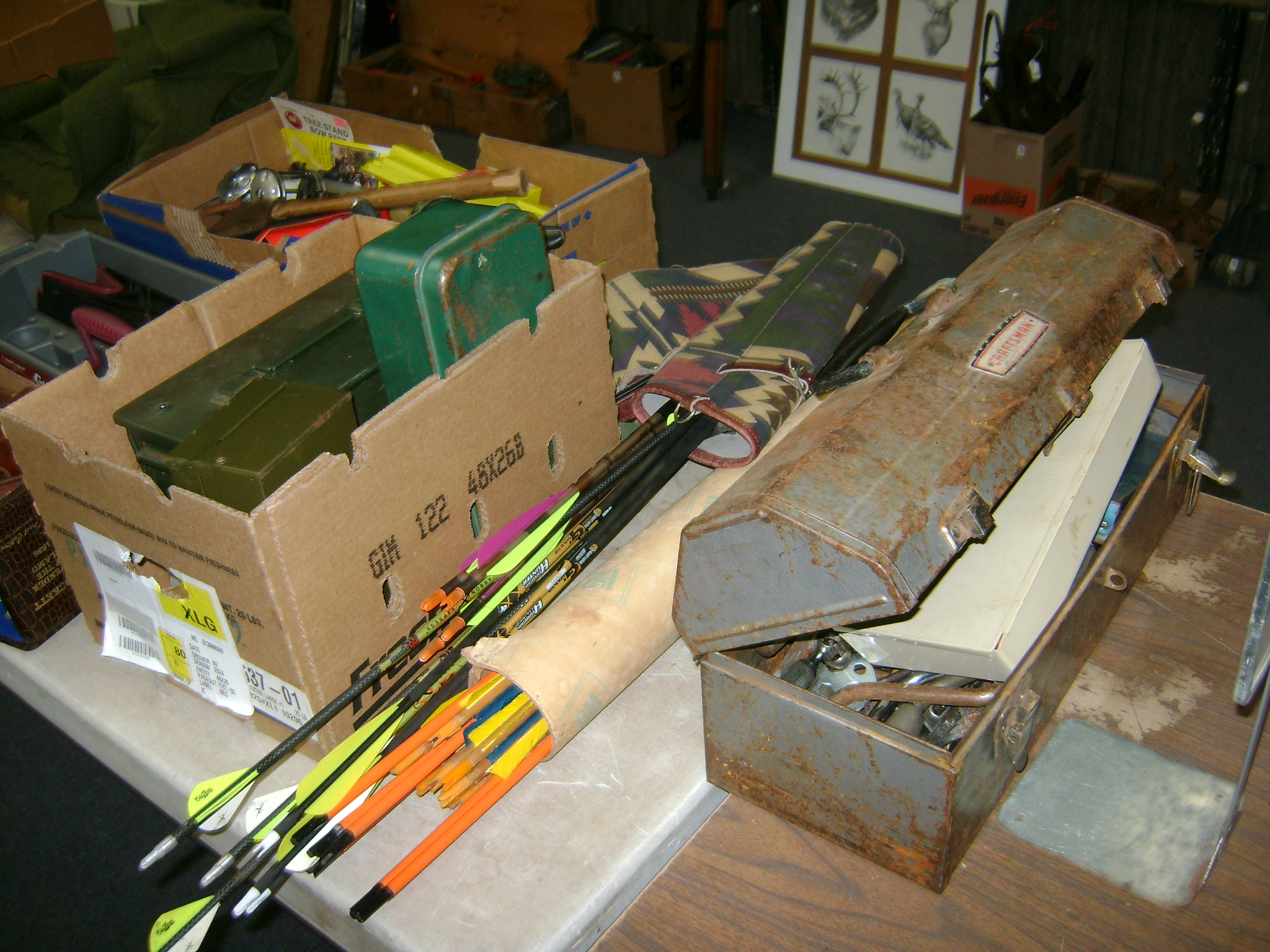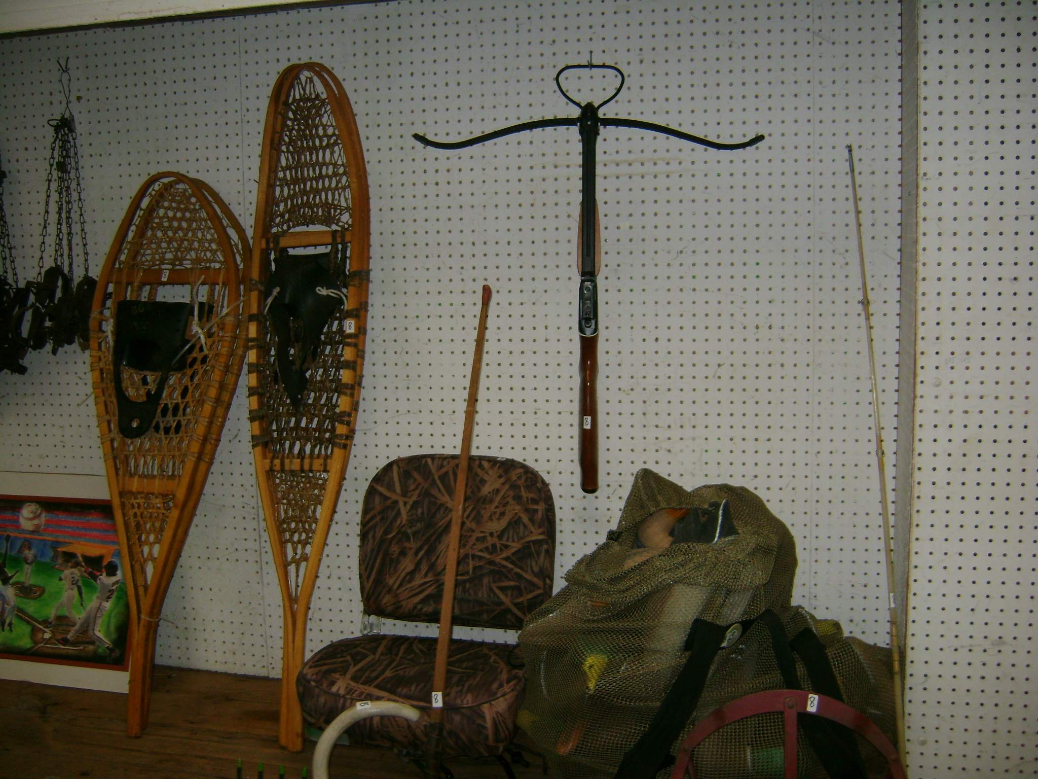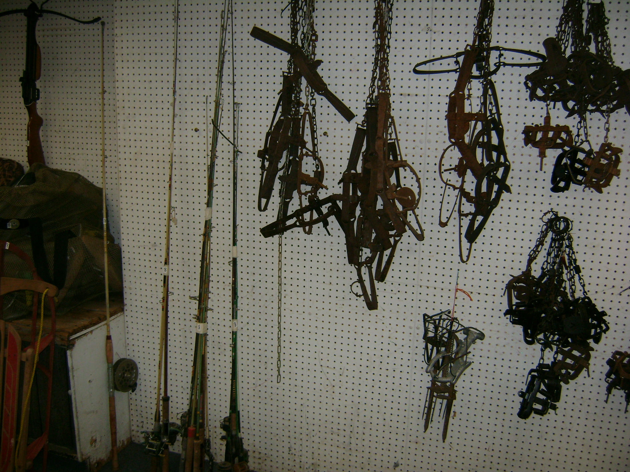 BB and Pellet Guns, traps, Ammo and Ammo boxes, knives, wood, cork and plastic decoys, Bear Polar and Super Grizzly recurve bows, Shakespear and Indian archery recurve bows, fishing rods, reels and tackle, signs, Coleman lanterns, oil and gas cans, MEC reloaders, cast iron pans, axes and hatchets, Orvis glass minnow trap, wood, aluminum and graphite arrows, snow shoes, chain saws, tools, gun cases, ice augers, Cobra 2000GTL channel AM/SSB CB radio and accessories, prints, cross bow, Mr. Heater, Eskimo portable ice shanty, PennYan wooden boat.