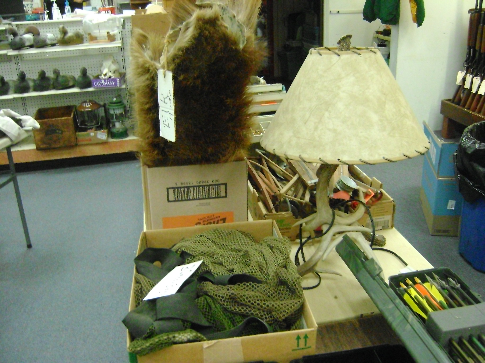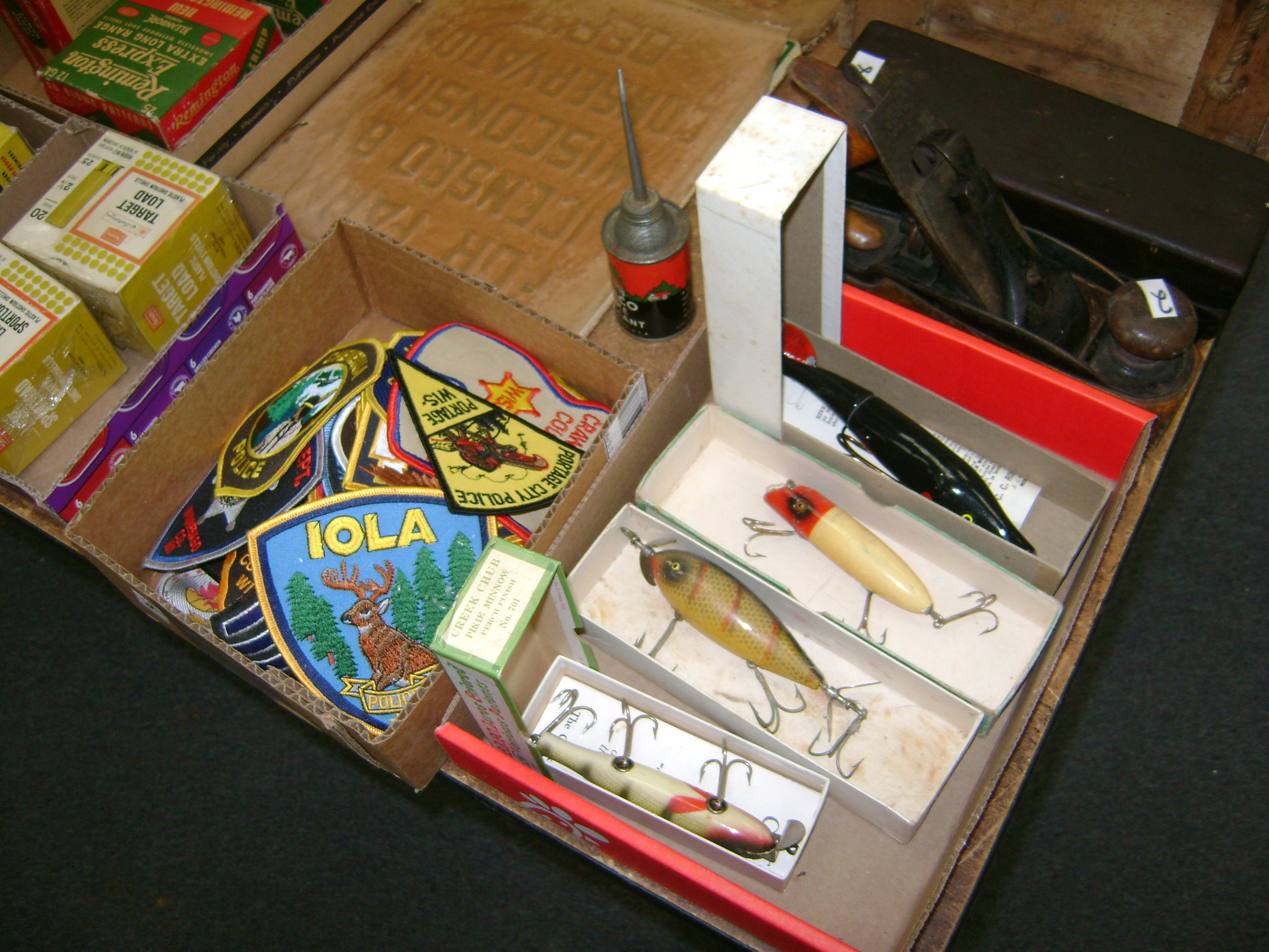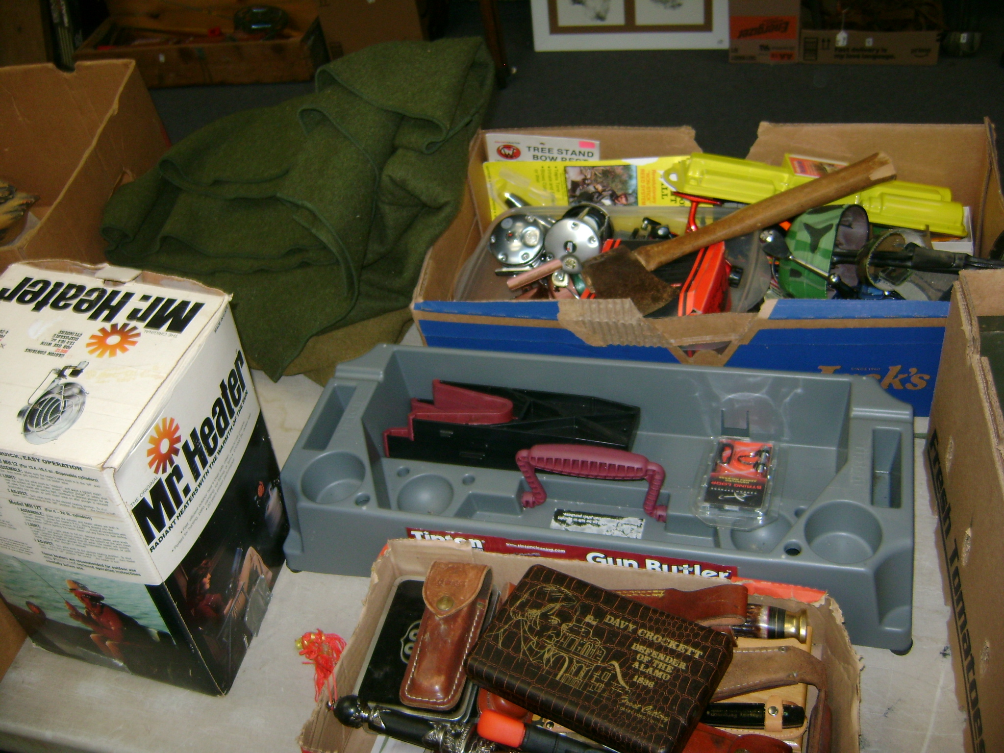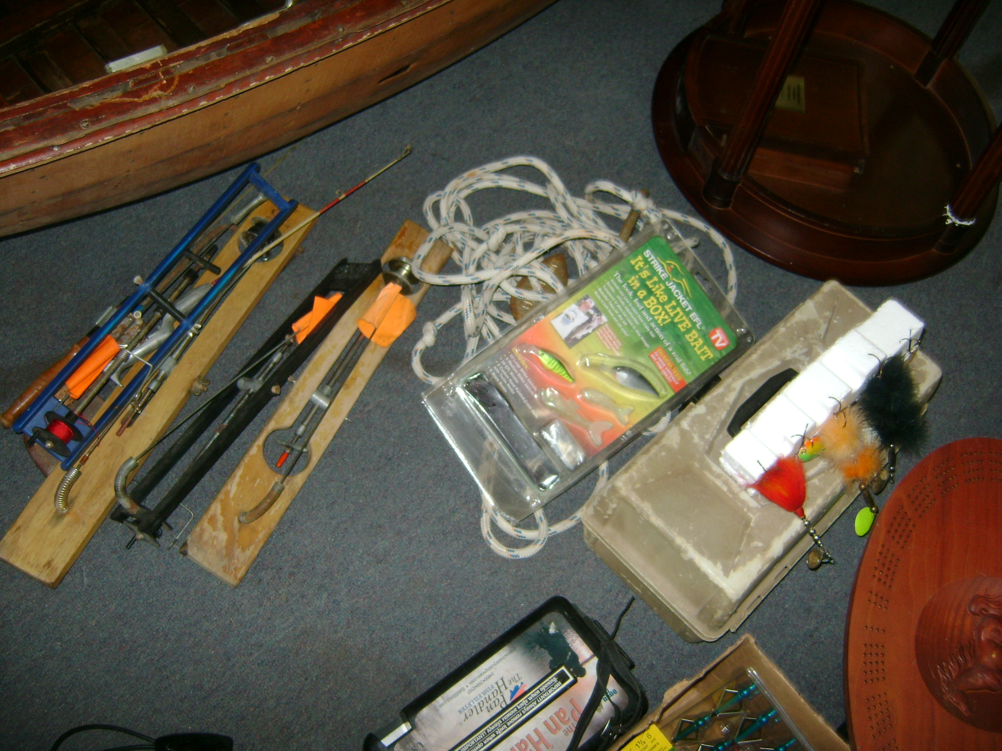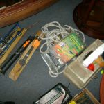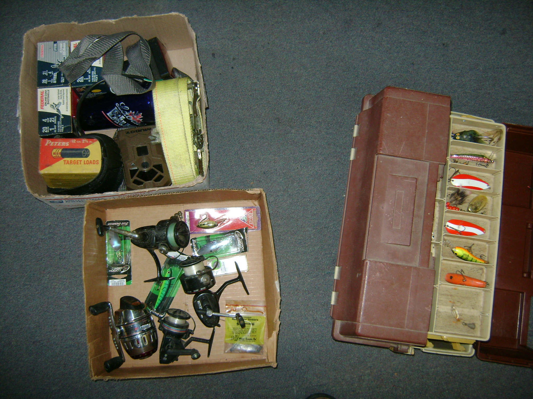 BB and Pellet Guns, traps, Ammo and Ammo boxes, knives, wood, cork and plastic decoys, Bear Polar and Super Grizzly recurve bows, Shakespear and Indian archery recurve bows, fishing rods, reels and tackle, signs, Coleman lanterns, oil and gas cans, MEC reloaders, cast iron pans, axes and hatchets, Orvis glass minnow trap, wood, aluminum and graphite arrows, snow shoes, chain saws, tools, gun cases, ice augers, Cobra 2000GTL channel AM/SSB CB radio and accessories, prints, cross bow, Mr. Heater, Eskimo portable ice shanty, PennYan wooden boat.