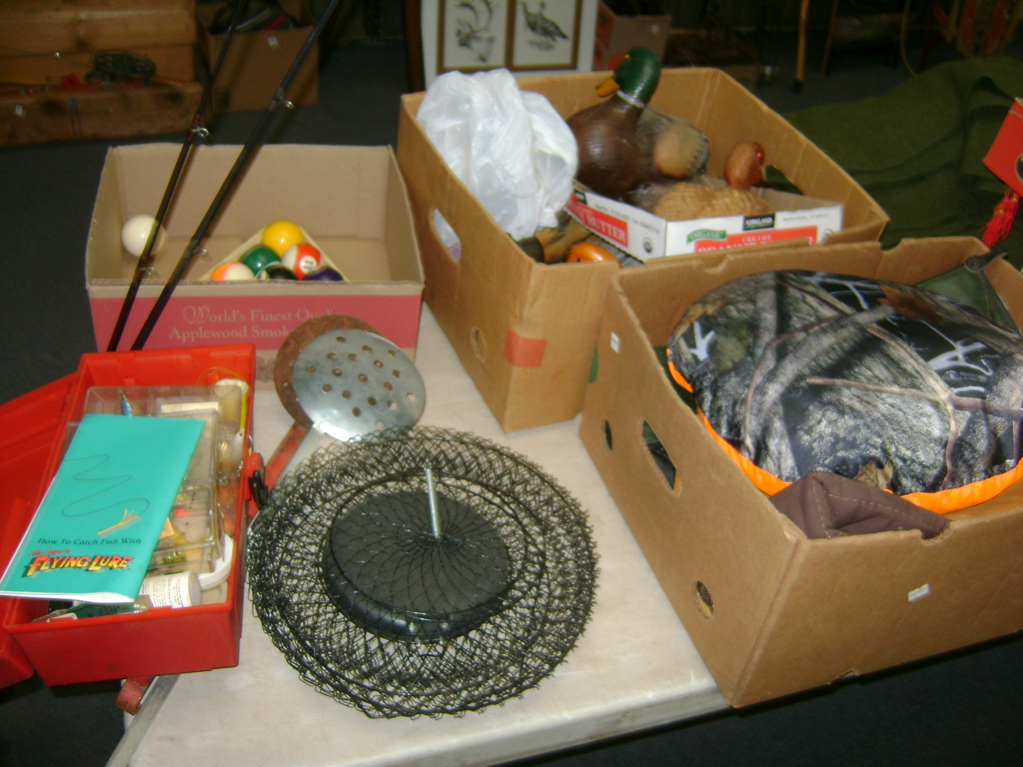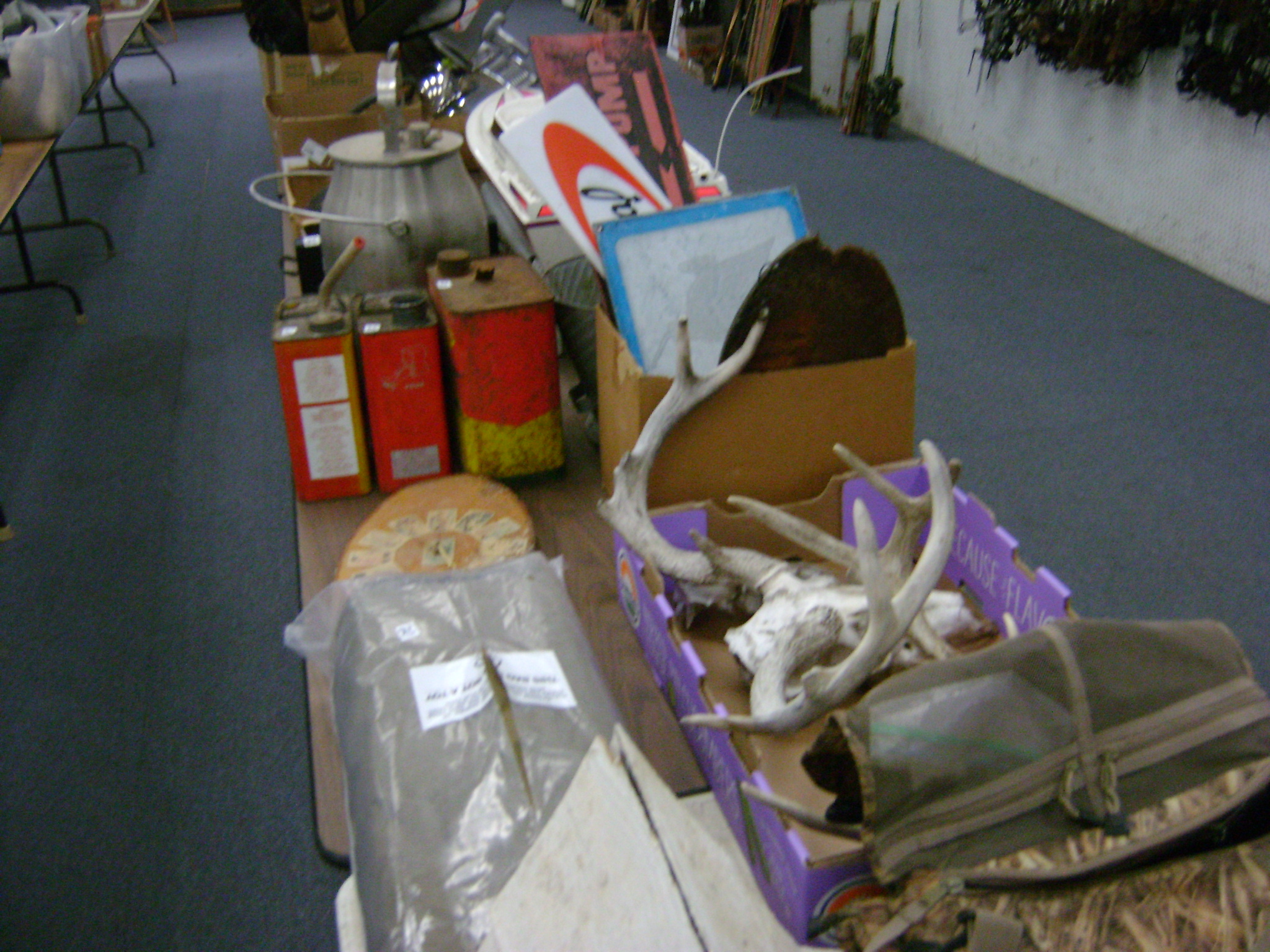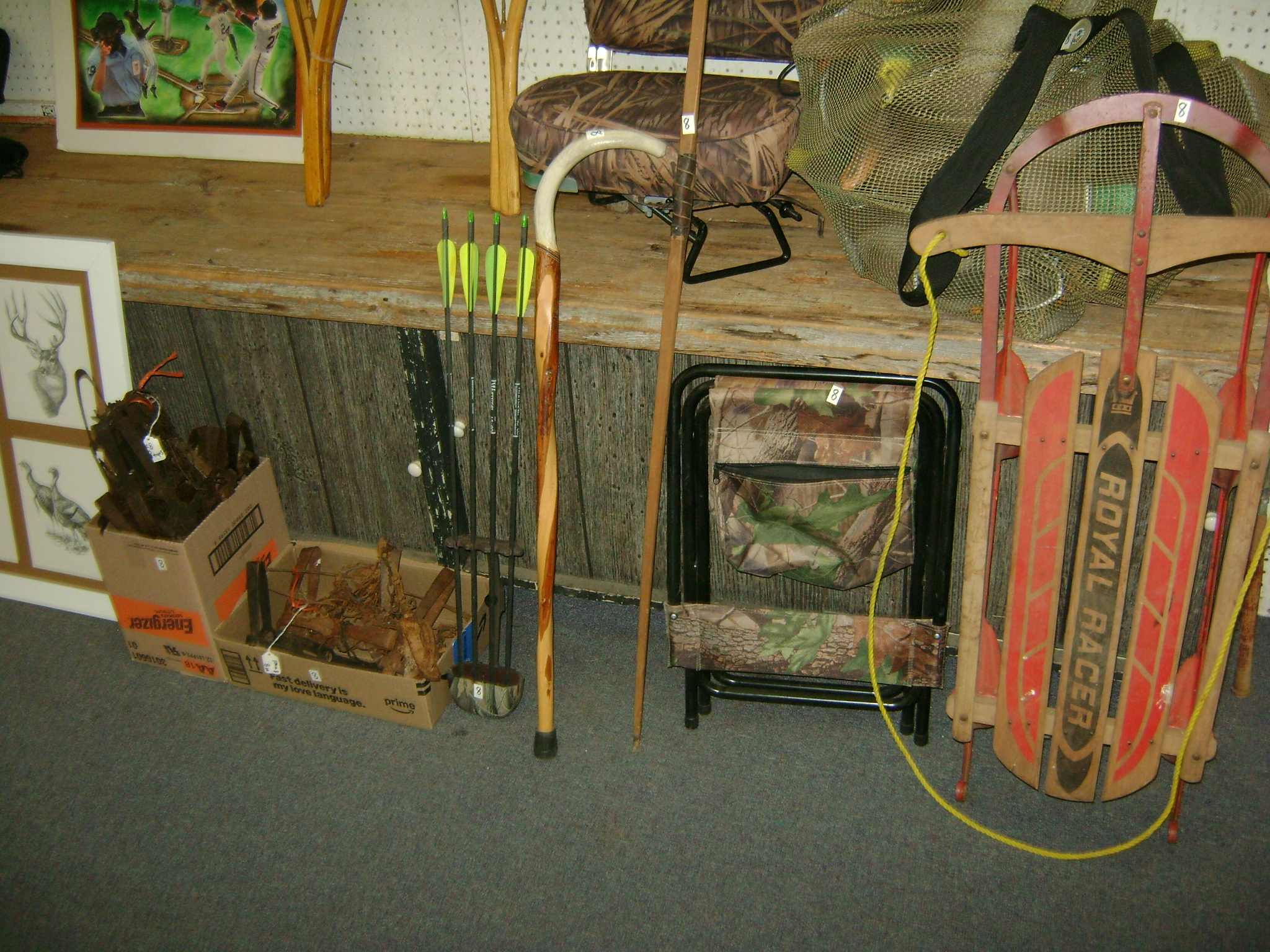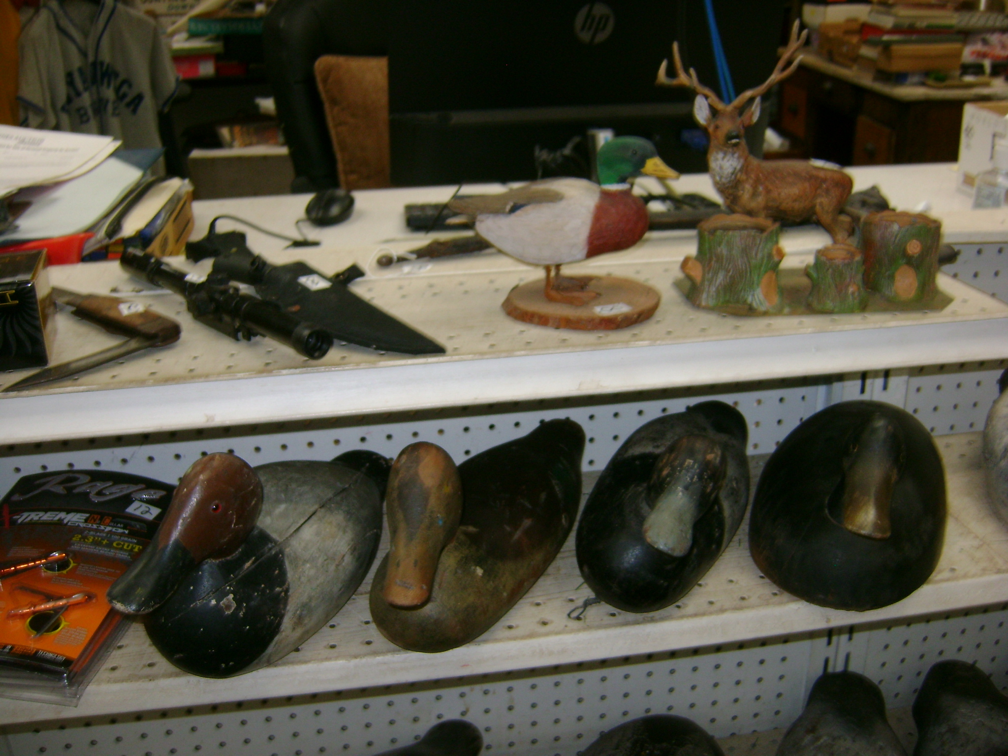 BB and Pellet Guns, traps, Ammo and Ammo boxes, knives, wood, cork and plastic decoys, Bear Polar and Super Grizzly recurve bows, Shakespear and Indian archery recurve bows, fishing rods, reels and tackle, signs, Coleman lanterns, oil and gas cans, MEC reloaders, cast iron pans, axes and hatchets, Orvis glass minnow trap, wood, aluminum and graphite arrows, snow shoes, chain saws, tools, gun cases, ice augers, Cobra 2000GTL channel AM/SSB CB radio and accessories, prints, cross bow, Mr. Heater, Eskimo portable ice shanty, PennYan wooden boat.