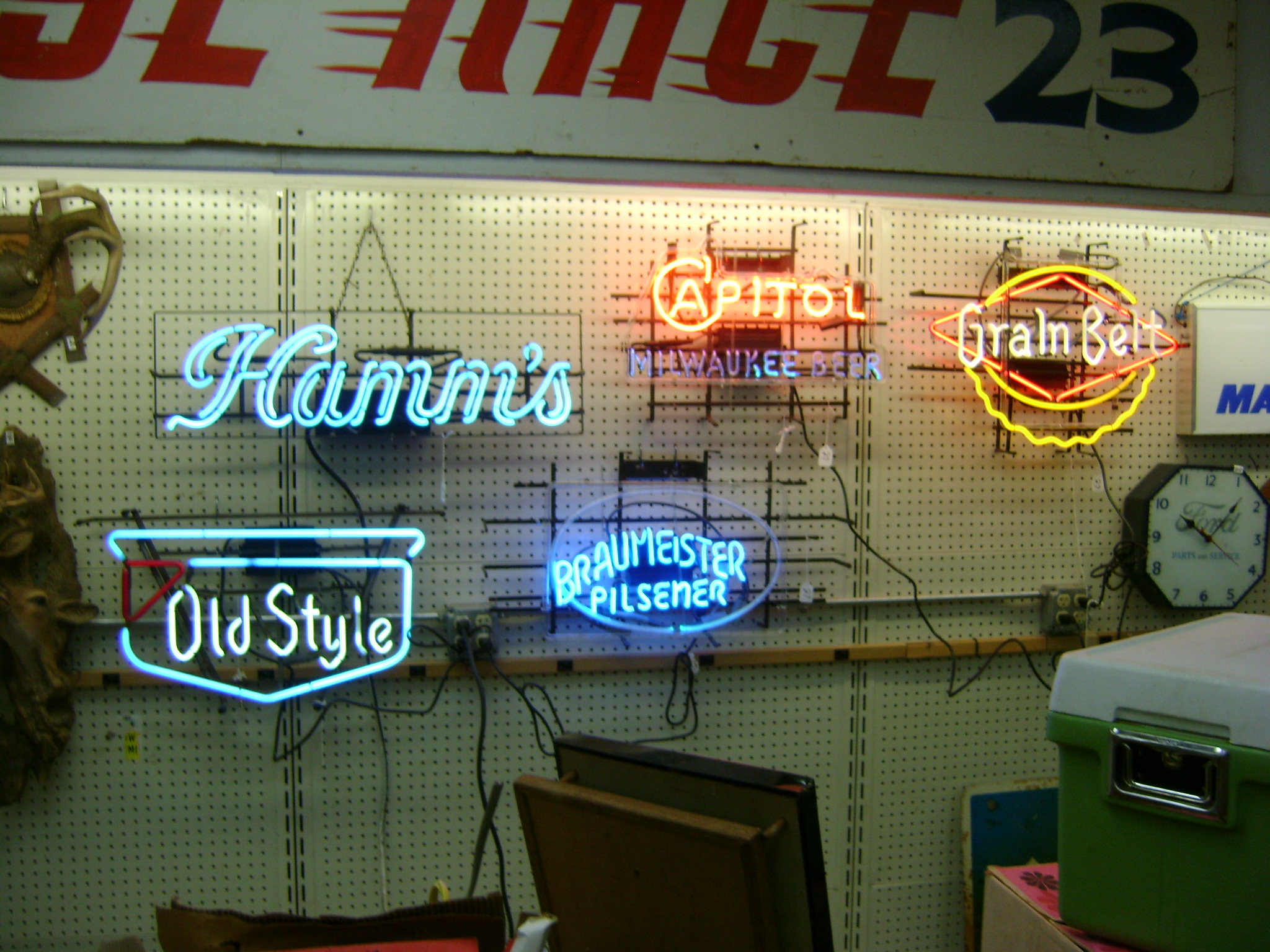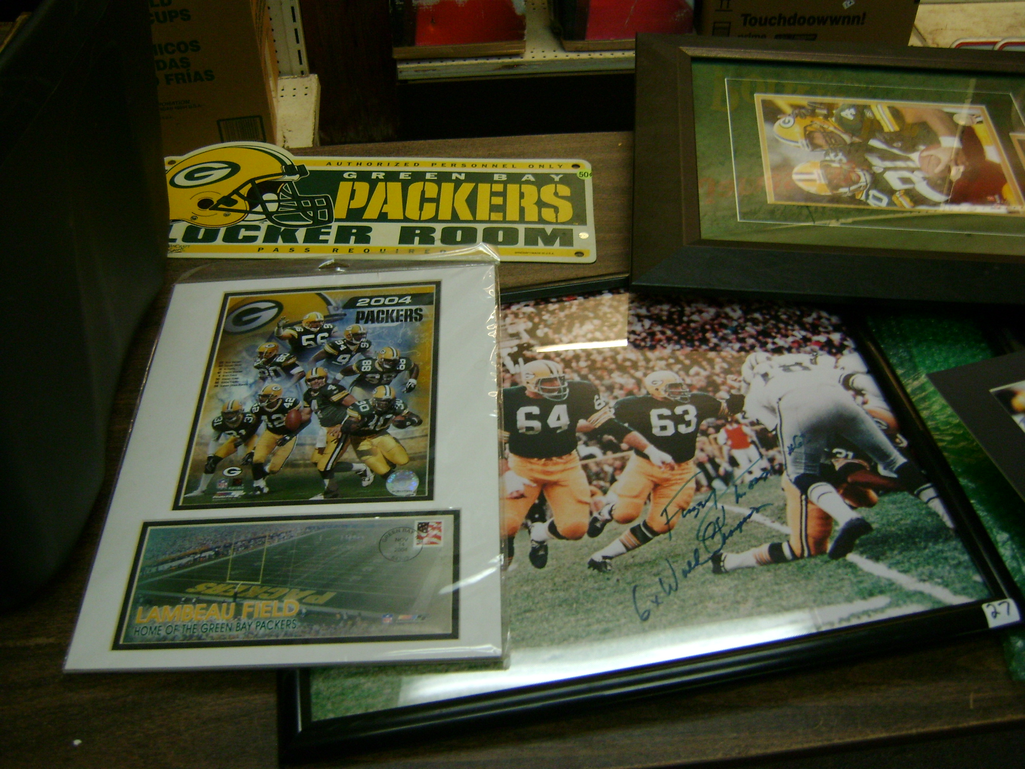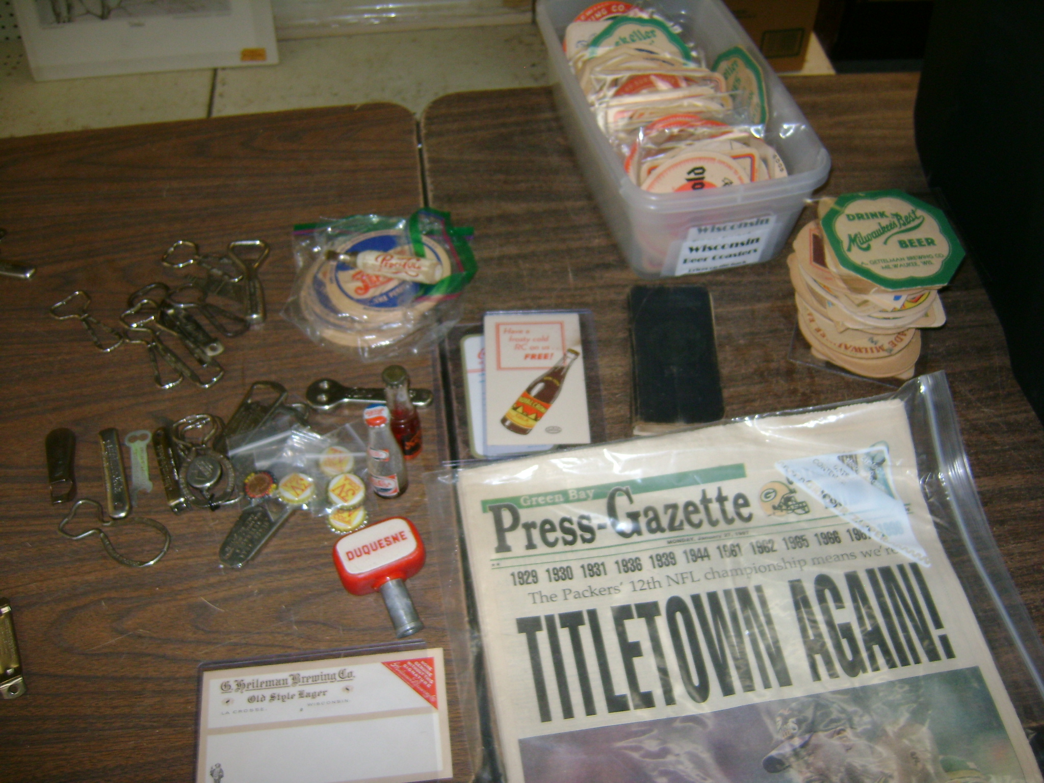 Neon Beer Signs, Beer Trays, beer bottle openers, coasters, glasses, and advertising items, Packer pictures, Fuzzy Thurston and Brett Favre, autographed pictures