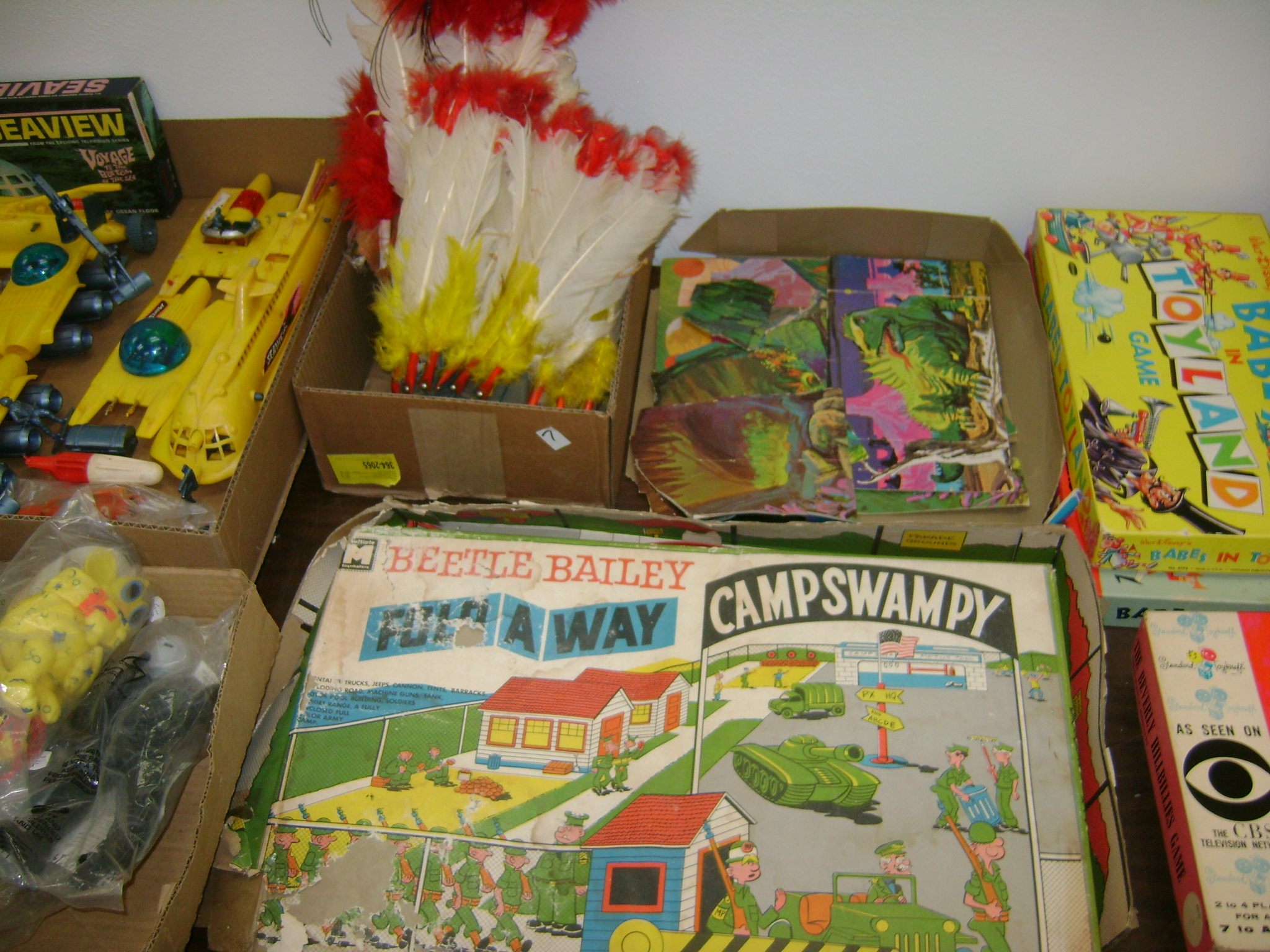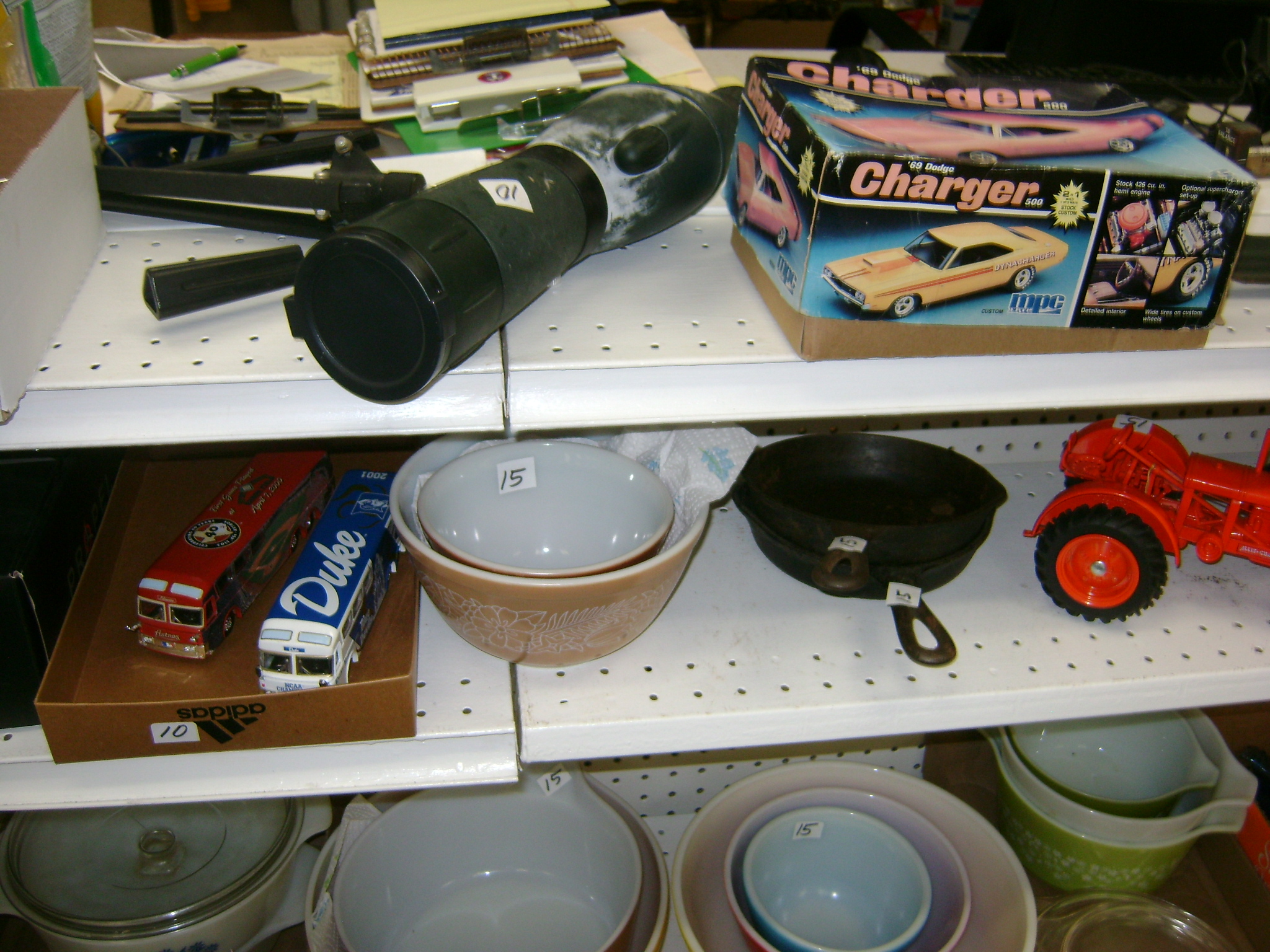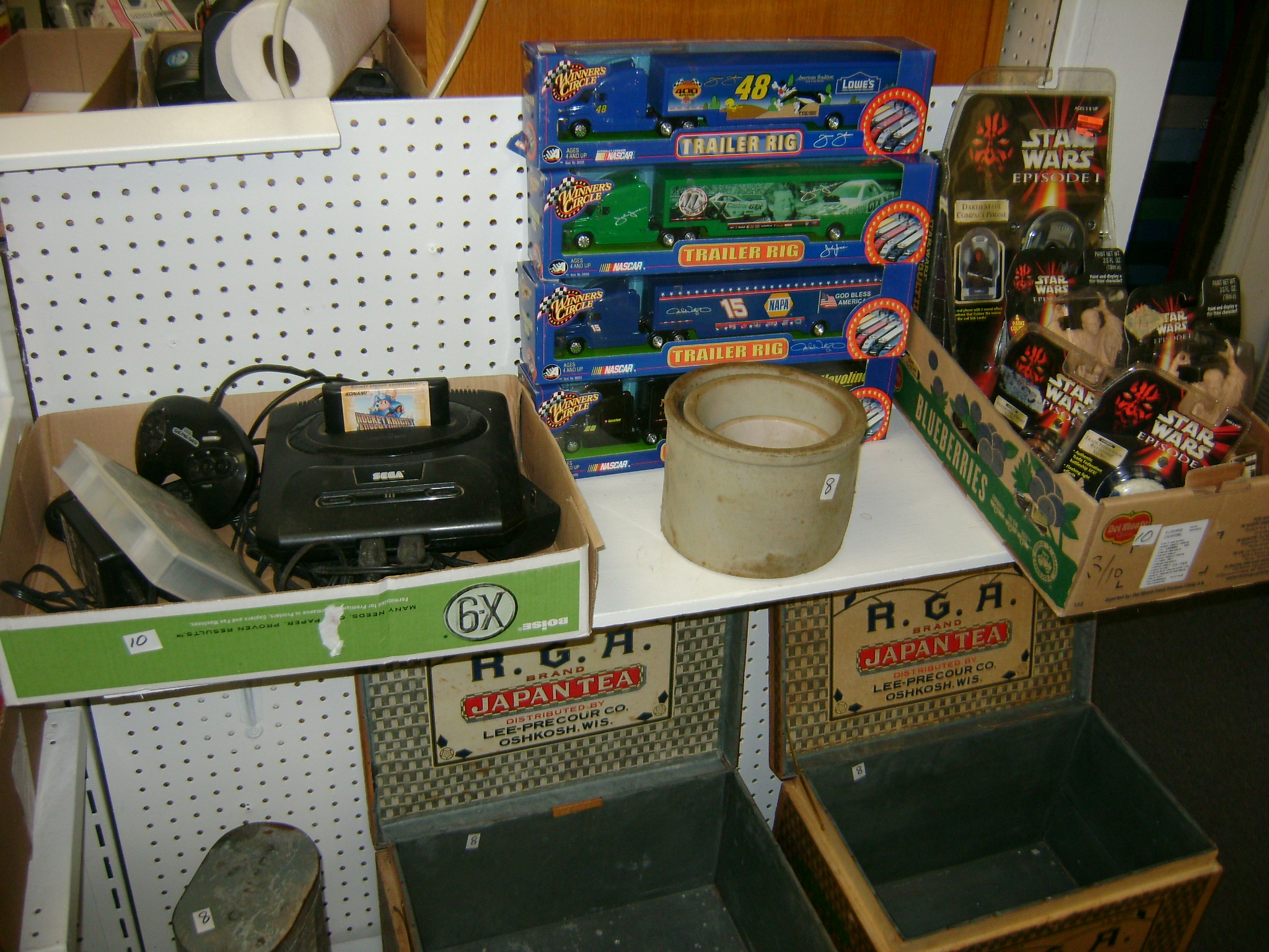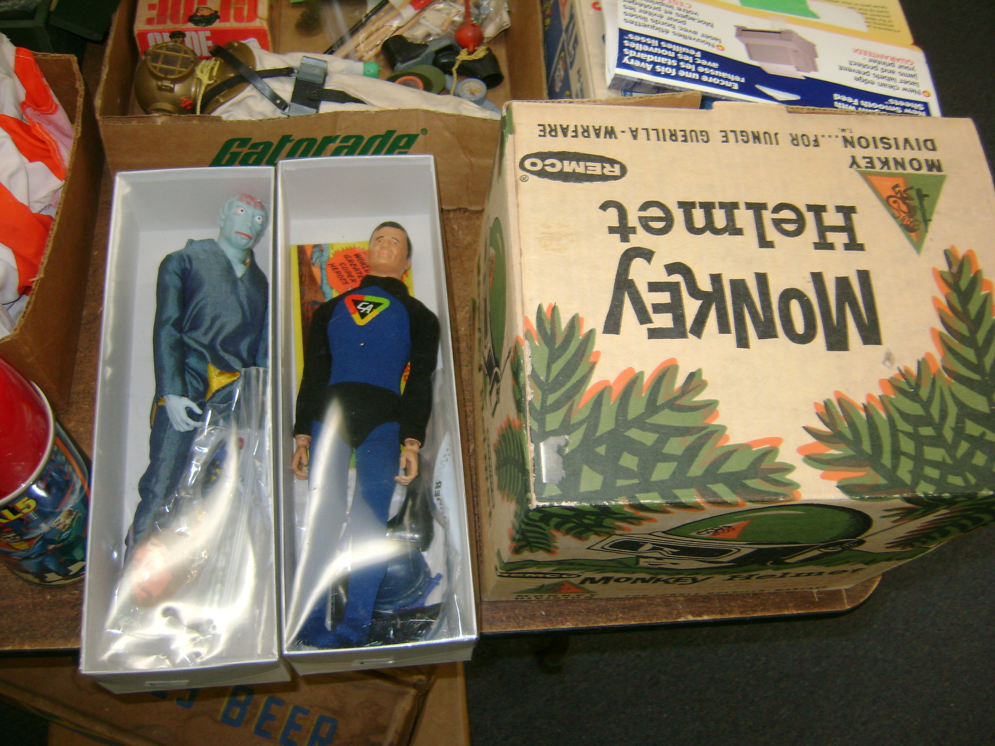 1966 Ideal Captain Action & Dr. Evil figures, Remco Monkey Helmet, Steve Zodiac Fireball XL5, GI Joe & accessories, Mike Mercury Super car lunchbox & thermos, comic books, voyage to the bottom of the sea toys and games, Sar Trek modes, 1960’s coloring books & puzzles, Babes in Toyland Toys, Military & Castle playsets, cartoon bottles, Allis Chalmers toy tractors, political pinback buttons, knives, toy mustangs & other toys, signs, beer glasses, large Budweiser bottles, trumpet and saxophone, mantle clock, Oshkosh tea boxes, Coleman lanterns, C&NY Railway Flair holder, Pyrex, cast iron pans, spotting scope, scopes, patches, jewelery, advertising items, Precious Moments collection, leather jackets, Winchester Model-1911SL 12 ga “Widow Makers” shotgun, Remington 870 Express 12ga, Remington 870 Wingmaster 12ga, Remington Model 11-48 20ga, Remington TargetMaster model 510 22cal rifle, Rewmington Speed Master model 552 22cal, Columbia 12 ga single shot, Taurus Rossi 410ga, cigar boxes, tools and hardware, floor and table lamps, records, pedal firecar, Royal Oak Cast ironwood stove, metal cabinets, hutch, wardrobes, corner cabinet, lawn chairs, vintage chainsaw, bench grinder, Delta sander, Craftsman planer, Craftsman table router, ship, plastic cabinets, vintage doctors exam table, Enterprise sausage stuffer, golf clubs, shop lights, step ladders, fans, plastic cabinets, TV;s, vintage department store rack, work tables, pew, chairs, sewing machine, holiday and yard ornaments, pictures, household, collectibles and more